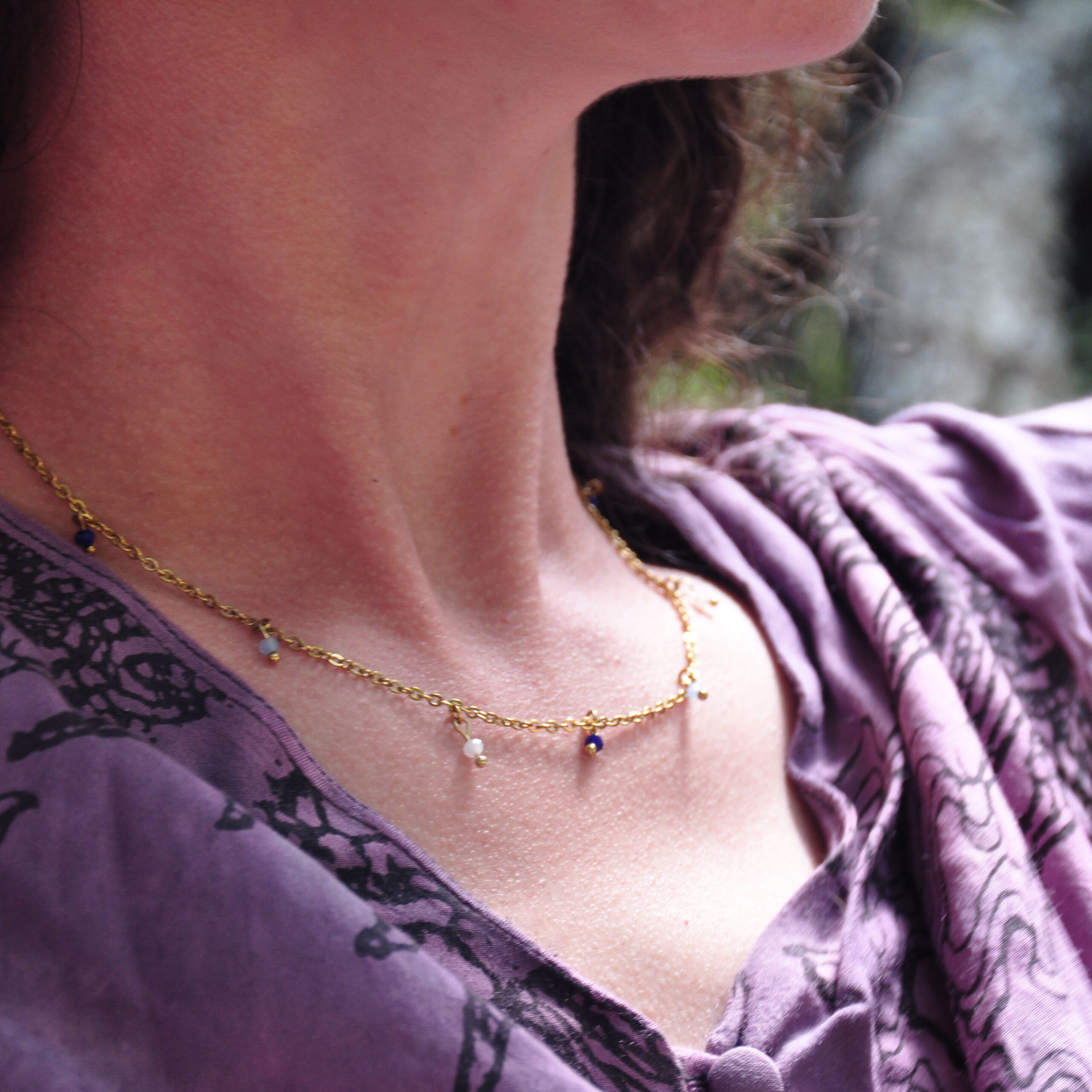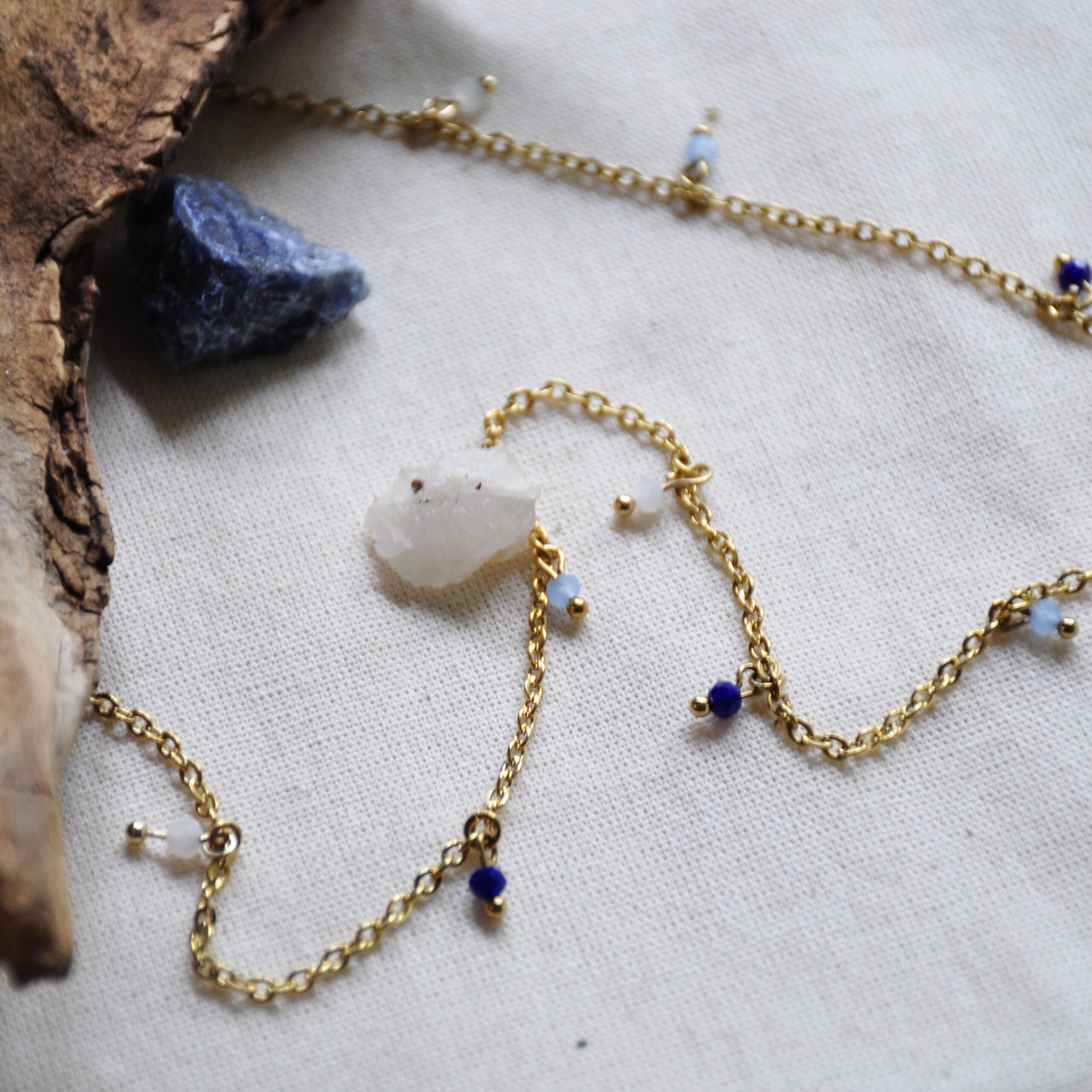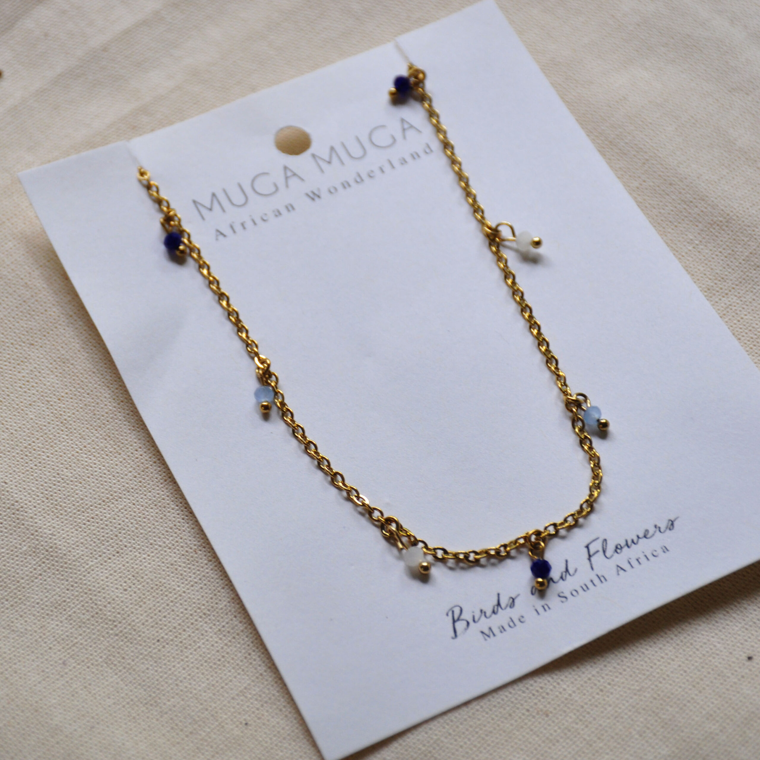 Dainty gold chain necklace featuring faceted deep prussian blue, sky blue, and milky white. Inspired by the African landscape, the colors evoke dreamy skies, dramatic clouds, and faraway mountains.