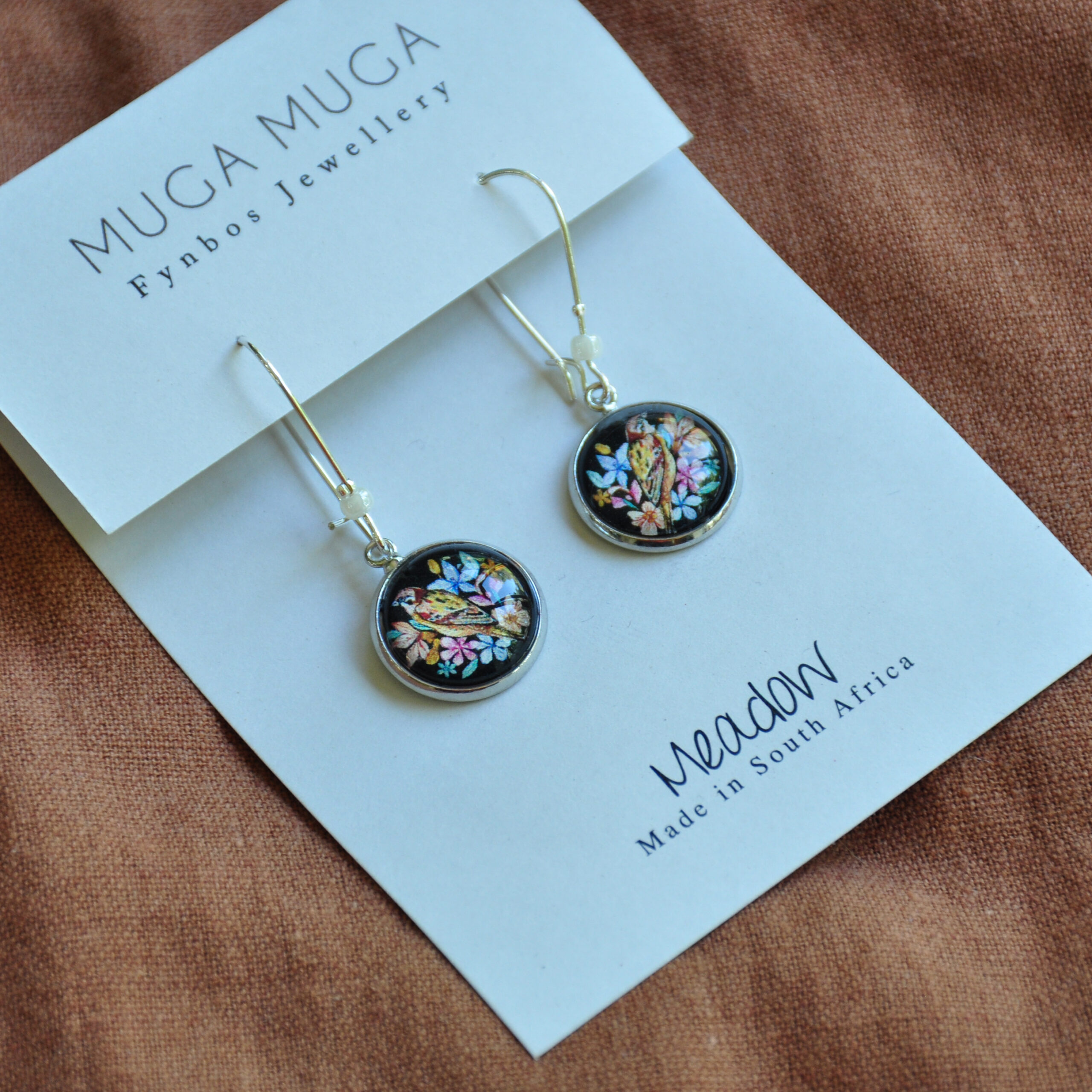 The cape sparrow is a humble and homey bird with distinct brown patterns. Our dangle earrings are a homage to this native little bird, encasing hand painted artwork in clear domed glass.