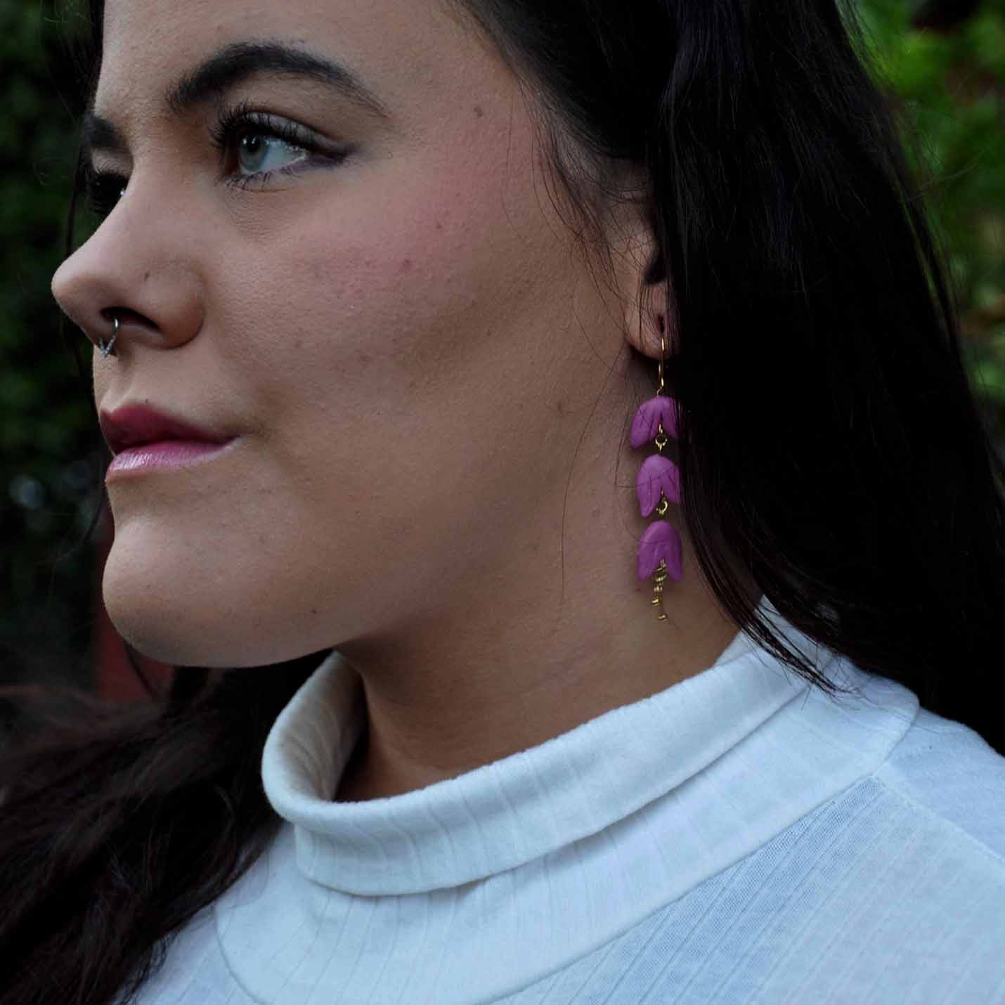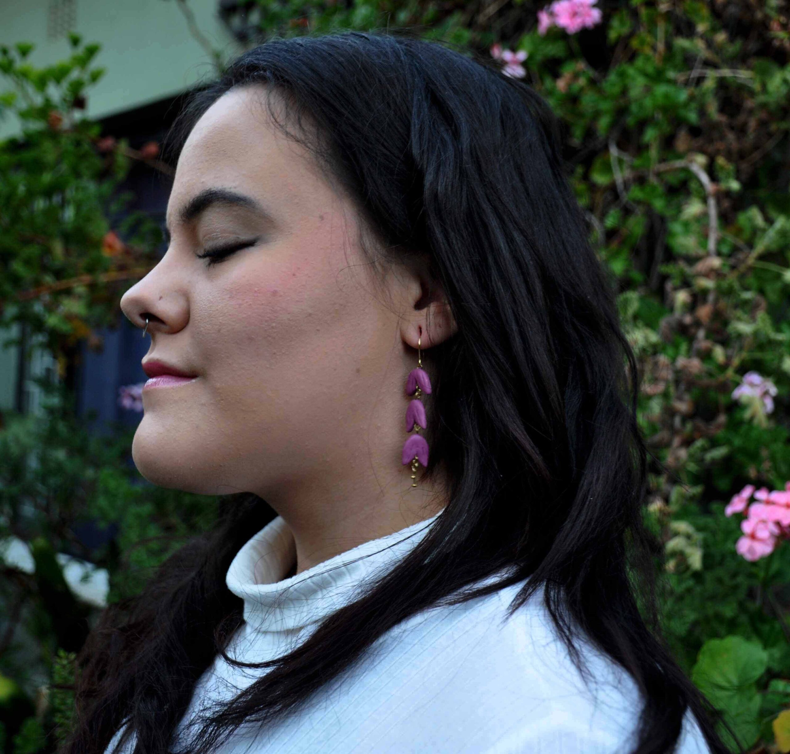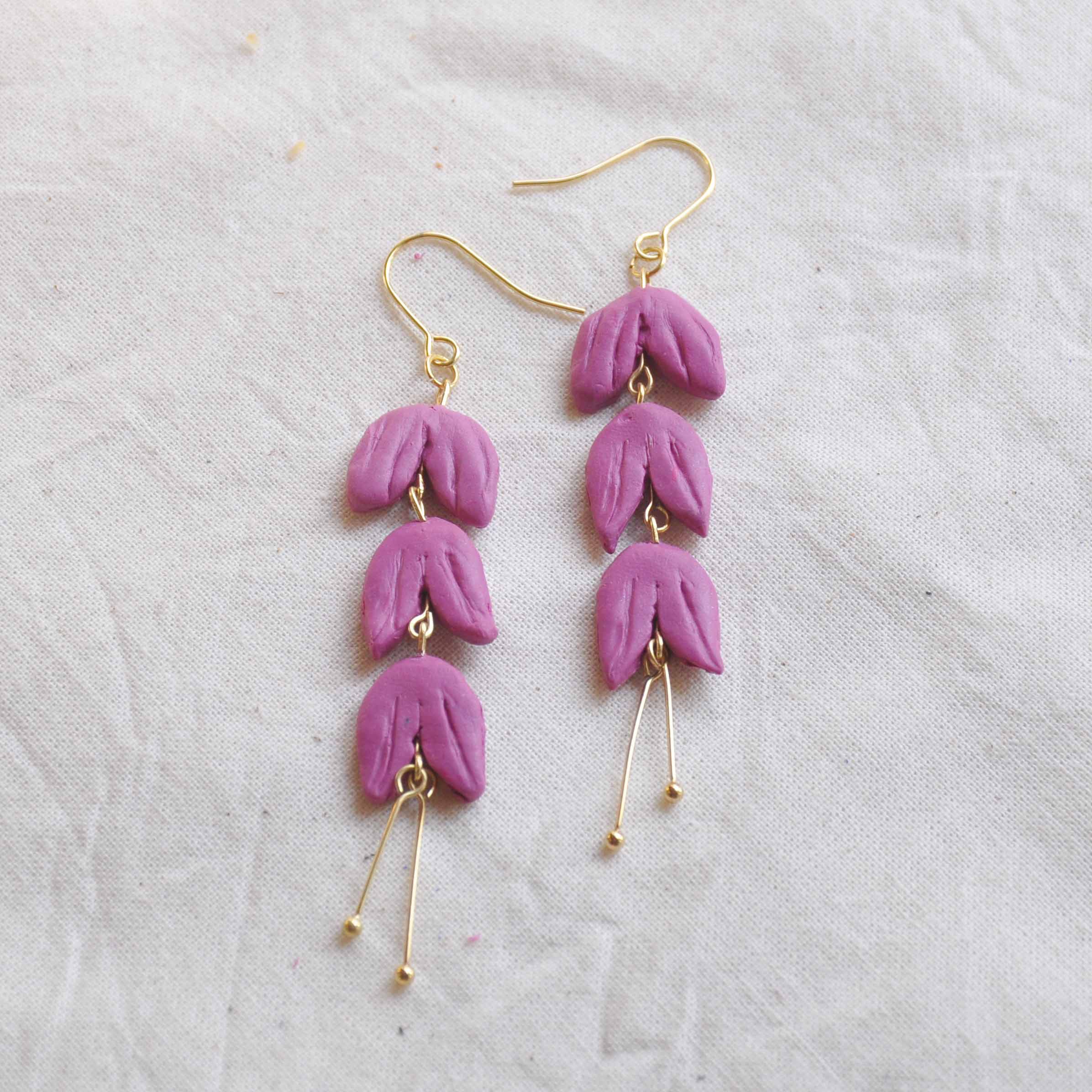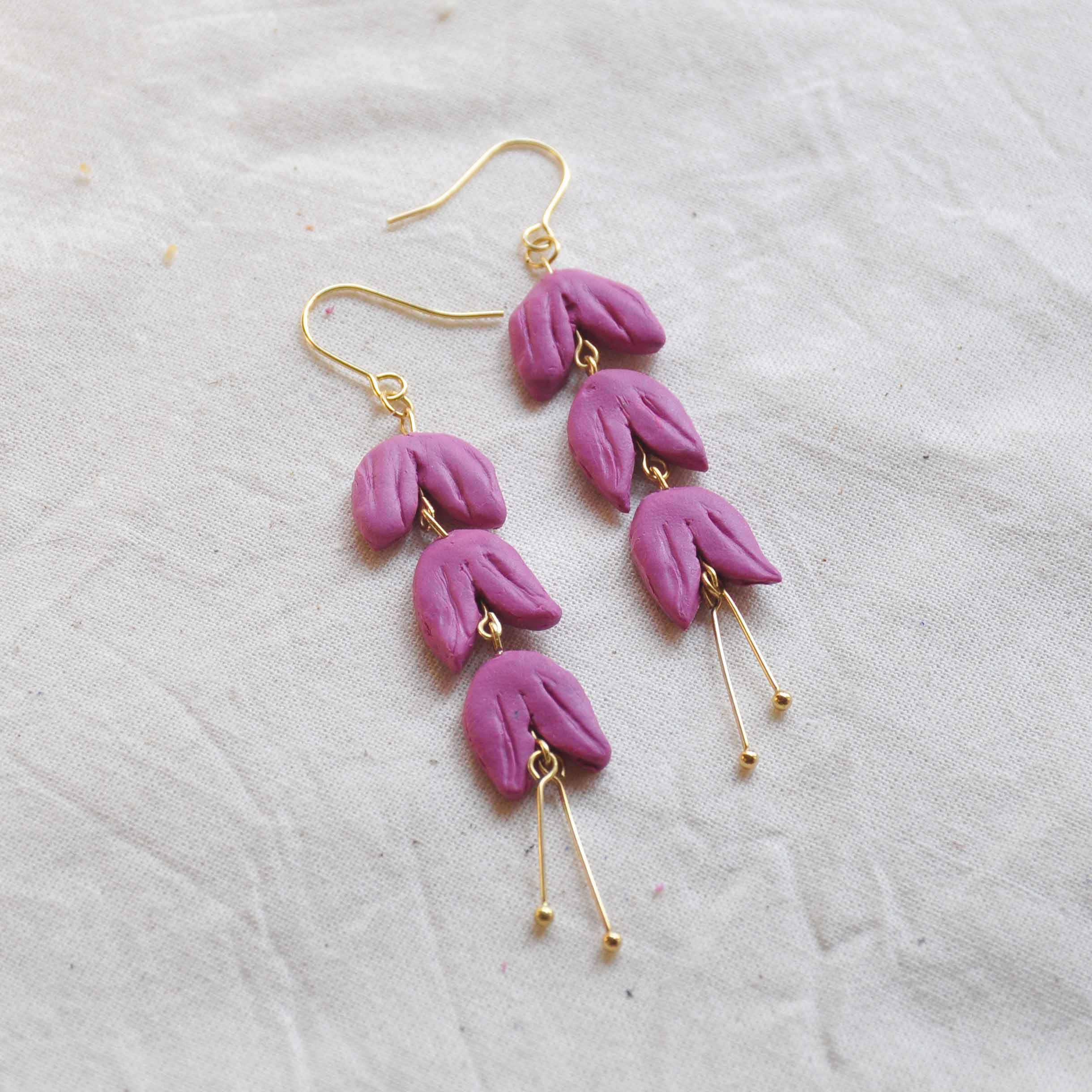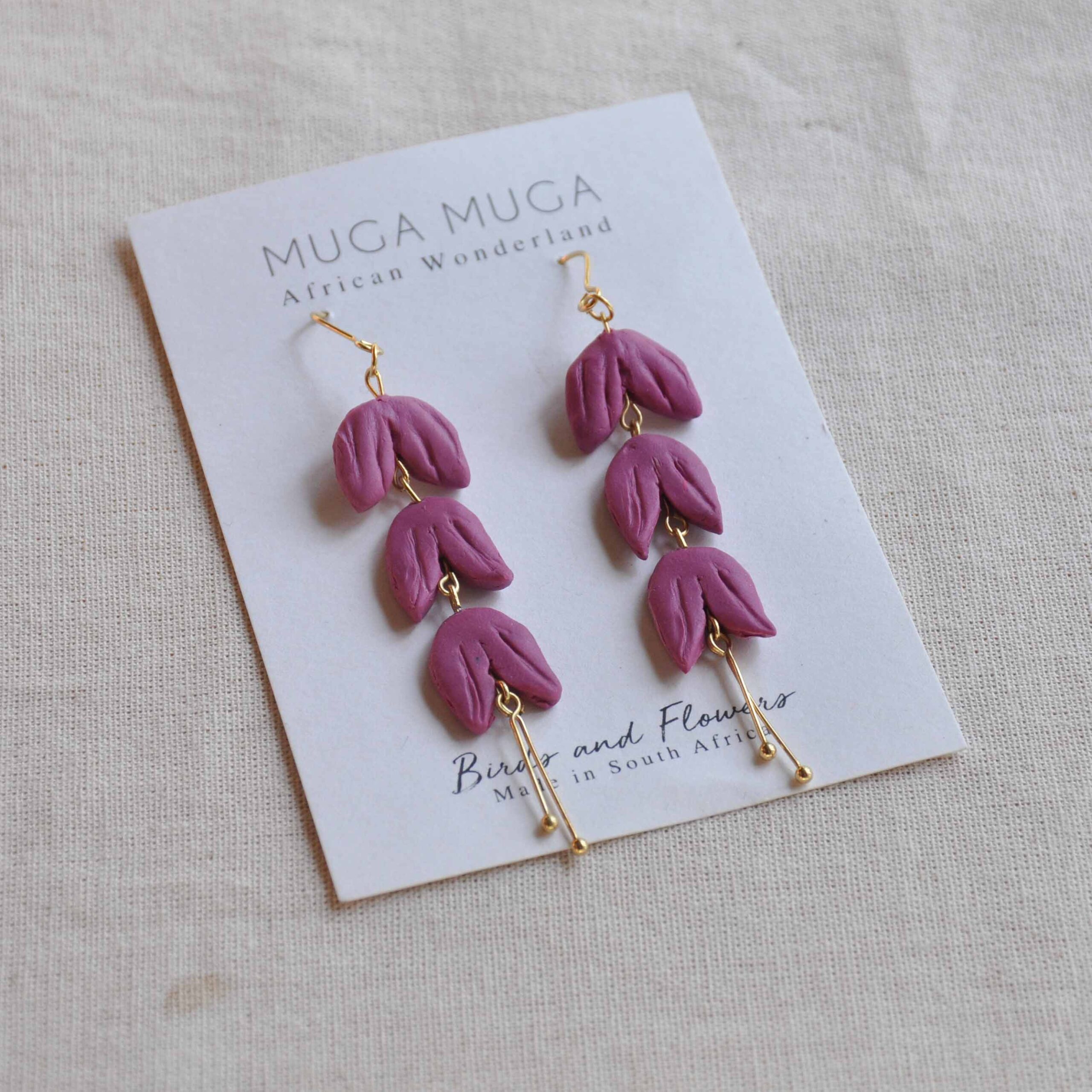 “Handcrafted soft pink dangle earrings, accented with real gold-plated highlights. Made from lightweight oven-baked clay, these earrings evoke the lush botanical beauty of our African Wonderland.”