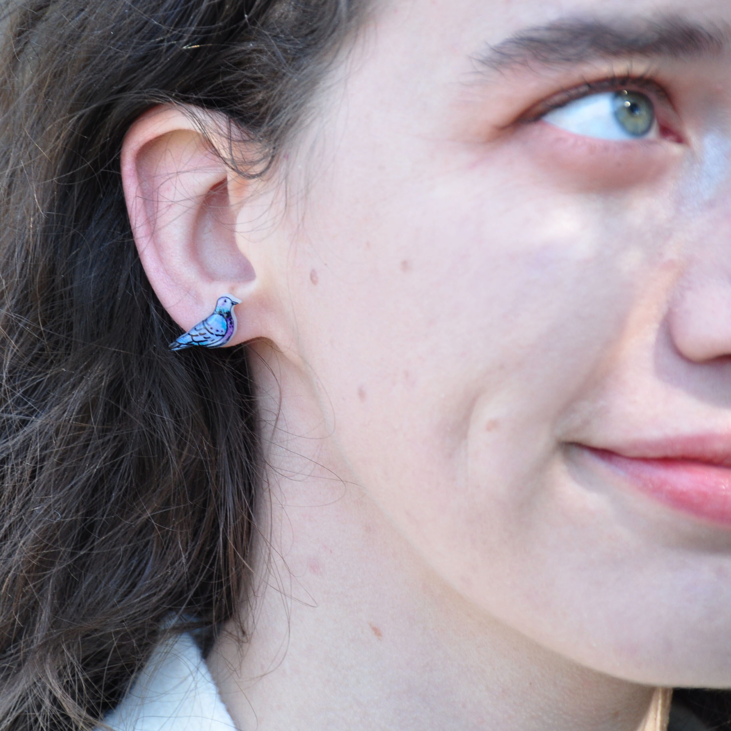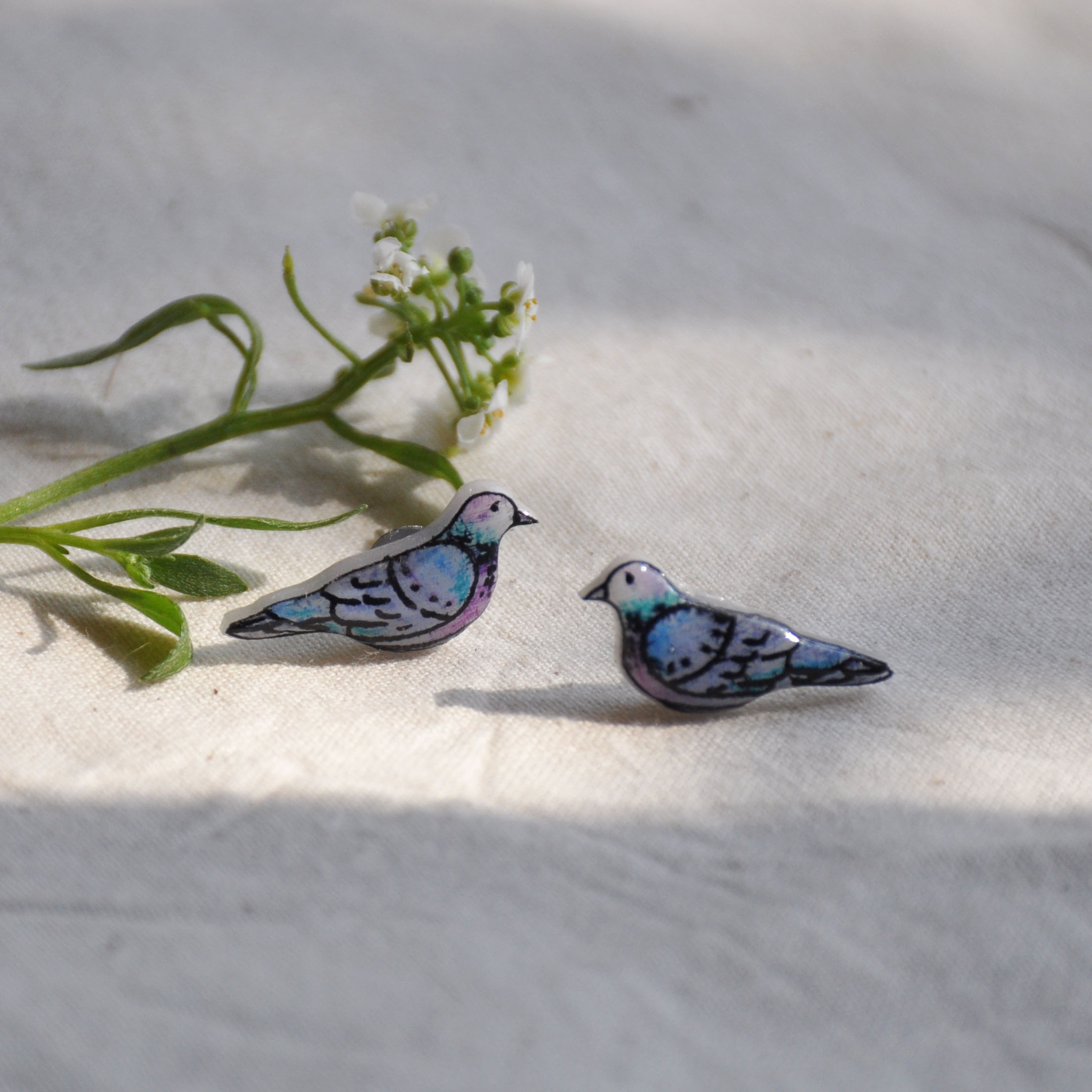 Made with shrink plastic, a kind of plastic that can be drawn on and then shrinks when heated. Sealed with a gloss resin layer and fitted with stainless steel stud backs.