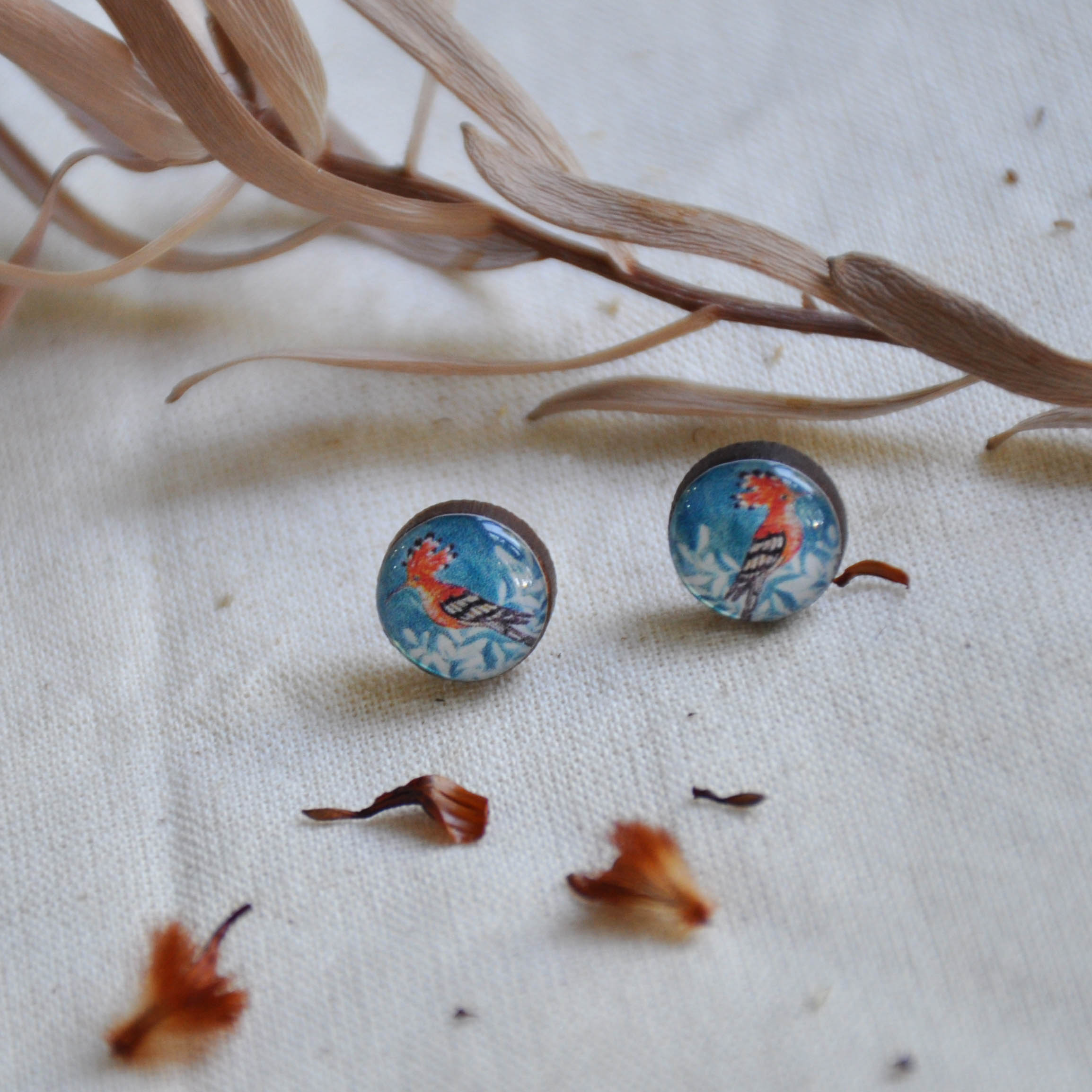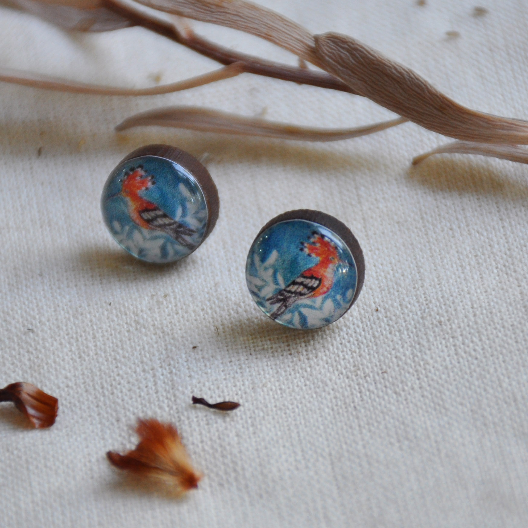 Wood and resin studs featuring original watercolour artwork by Marjorie Human. Available in 11 and 14mm size. Please refer to the model photos to make your size selection and make a note with your order. The artwork featured is inspired by the unique birdlife of South-Africa. The hoopoo is an beloved character of the South-African landscape because of its unique mohawk and contrasting patterned feathers. Light and comfortable for everyday wear, with nickle-free (non allergenic) posts.